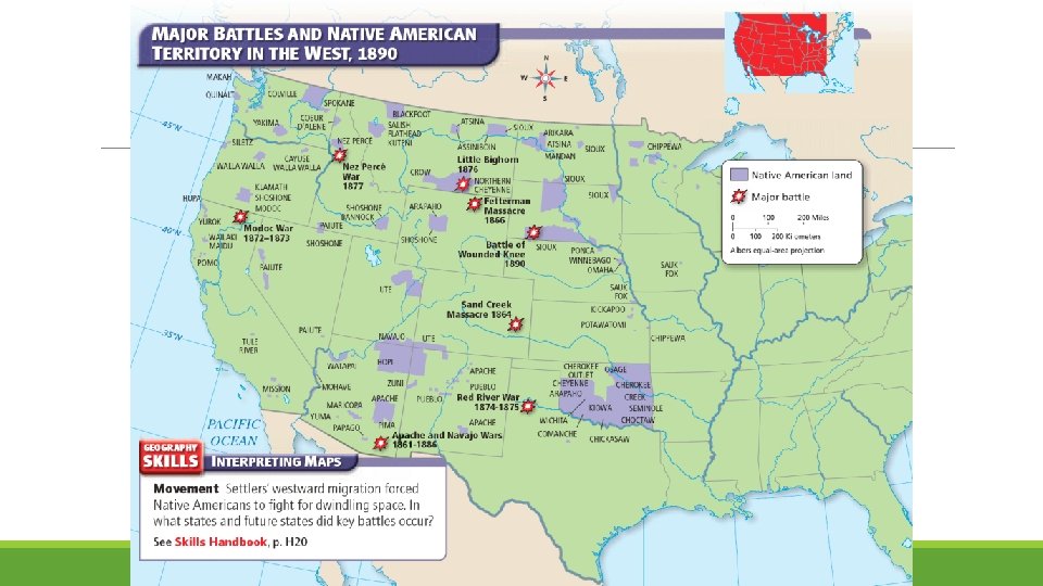 Conflict over Land was seized for mining, ranching ◦ Sand Creek Massacre – US soldiers slaughter Indians for leaving their reservation ◦ Battle of Little Bighorn – Sitting Bull defeats General Custer “Last Stand” ◦ Wounded Knee Massacre – Men, Women, and children slaughtered for Little Bighorn ◦ Instilled fear in other Indian groups