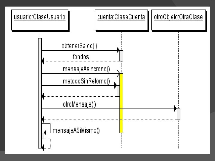 � Asincrónicos: terminan inmediatamente, y crean un nuevo hilo de ejecución dentro de la secuencia. Se representan con flechas con la cabeza abierta. � También se representa la respuesta a un mensaje con una flecha discontinua.