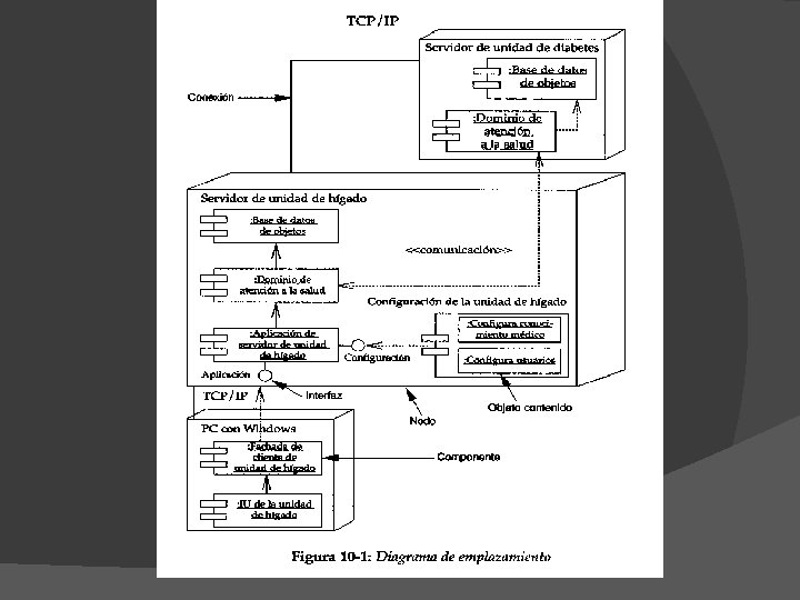 � Cada nodo de un diagrama de emplazamiento representa alguna clase de unidad de cómputo; en la mayoría de los casos se trata de una pieza de hardware. El hardware puede ser un dispositivo o un sensor simple, o puede tratarse de un mainframe (Computadora grande, poderosa y costosa utilizada principalmente en empresas que necesitan procesar gran cantidad de datos o soportar gran cantidad de usuarios. ). Los componentes en un diagrama de emplazamiento representan módulos físicos de código y corresponden exactamente a los paquetes de un diagrama de paquetes de tal modo que el diagrama de emplazamiento muestra dónde se ejecuta cada paquete en el sistema.