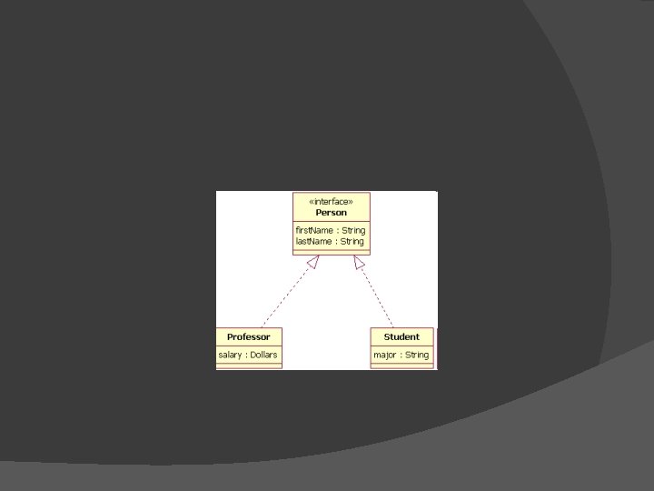 Ejemplo interface En el diagrama anterior las clases Professor y Student implementan a la interface Person y no heredan de ésta, podemos deducirlo a partir de: 1) El objeto Person de acuerdo a la simbología del diagrama está como una interface y Professor y Student están como clases. 2) No se trata de herencia ya que la línea con la flecha está punteada y no sólida.