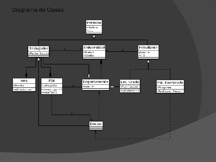 Diagrama de Clase: Agregación y Composición Cada agregación es un tipo de asociación. � Cada composición es una forma de agregación. � Asociación Agregación Composción