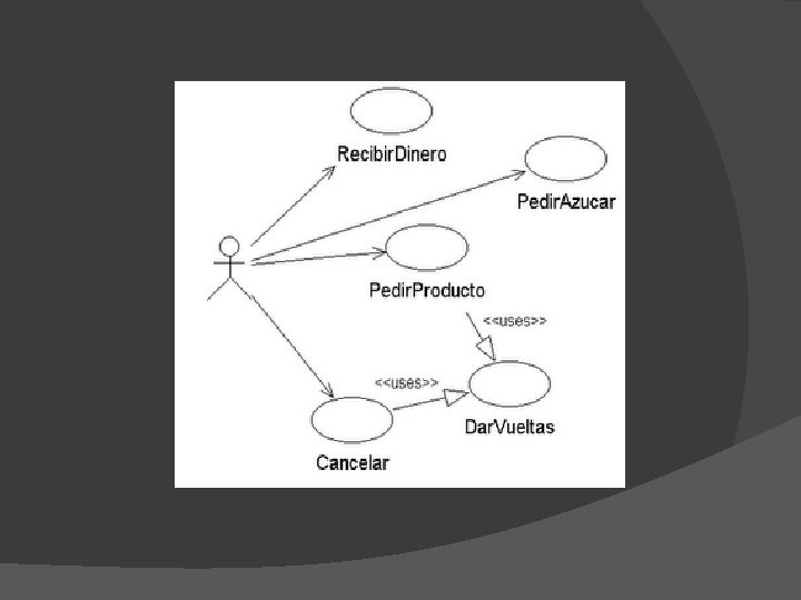 � Ejemplo � En el caso del ejemplo se tienen como casos de uso de la cafetera Recibir. Dinero, Pedir. Azucar, Pedir. Producto, Dar. Vueltas y Cancelar.
