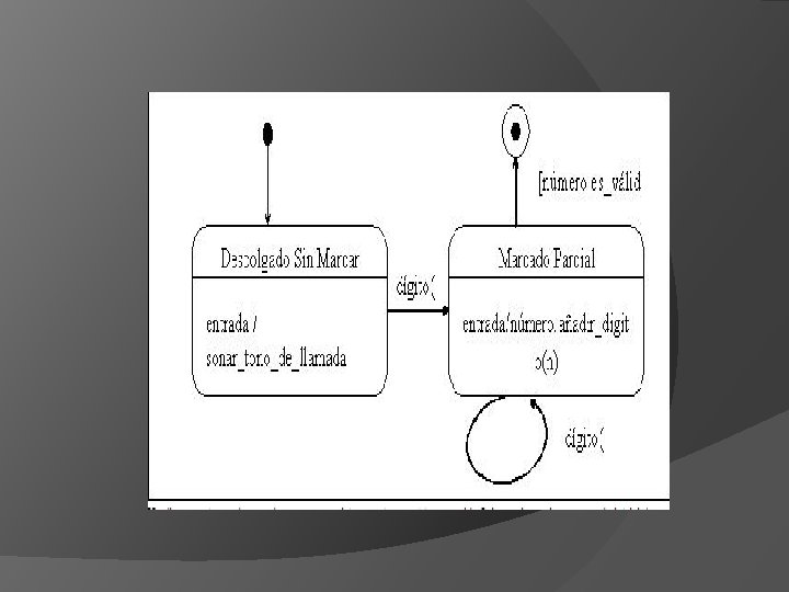 Subestados Un estado puede descomponerse en subestados, con transiciones entre ellos y conexiones al nivel superior. Las conexiones se ven al nivel inferior como estados de inicio o fin, los cuales se suponen conectados a las entradas y salidas del nivel inmediatamente superior. Transacción Compleja Una transición compleja relaciona tres o más estados en una transición de múltiples fuentes y/o múltiples destinos. Representa la subdivisión en threads del control del objeto o una sincronización. Se representa como una línea vertical de la cual salen o entran varias líneas de transición de estado.