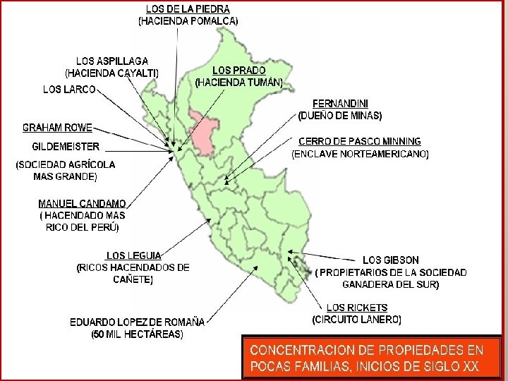 “Empresarios peruanos: socios menores del capitalismo extranjero” La guerra del Pacífico descapitalizó a un gran sector de hacendados peruanos y produjo el traspaso de muchas de sus propiedades a manos extranjeras. Este fue el caso de los hermanos Miguel y William Grace (Irlanda), llegados antes de la guerra, quienes adquirieron las ricas tierras de Cartavio; el de la familia Gildemeister (Alemania) que tomó en sus manos Casa Grande; o italianos como los Larco, que forma a la hacienda Roma en La Libertad.