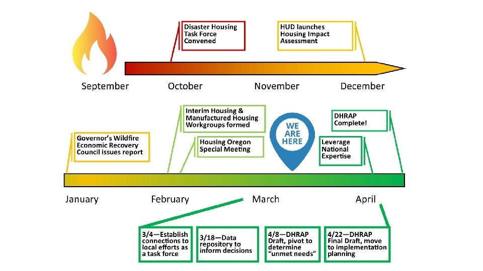 Disaster Housing Recovery Action Plan Outline Introduction & Executive Summary Impact of 2020 wildfires on pre-existing housing shortage Planning Process Elements of the Disaster Housing Recovery Action Plan Recovery Vision Goals & Strategies Success Measures Expedite Delivery of Permanent Housing Solutions Build Community & Family Resilience Core Values Goals Create Interim Housing Solutions Bolster Local Capacity Implementation Highlights