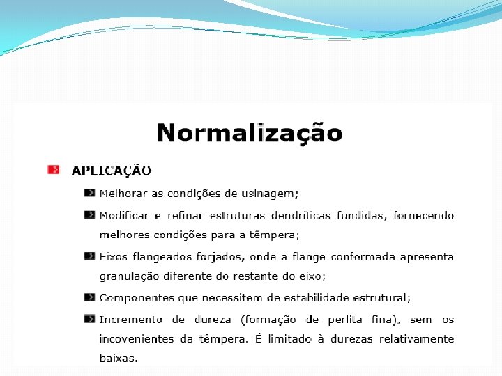 NORMALIZAÇÃO • Constituintes estruturais resultantes Hipoeutetóide ferrita + perlita fina Eutetóide perlita fina Hipereutetóide cementita + perlita fina * Em relação ao recozimento a microestrutura é mais fina, apresenta menor quantidade da fase pro-eutetóide e melhor distribuição de carbonetos