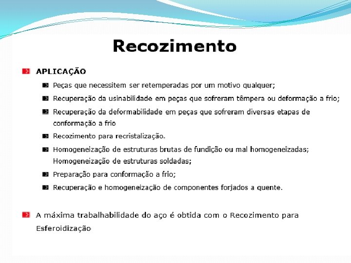 1 - RECOZIMENTO n Objetivos: - Remoção de tensões internas devido aos tratamentos mecânicos - Diminuir a dureza para melhorar a usinabilidade - Alterar as propriedades mecânicas como a resistência e ductilidade