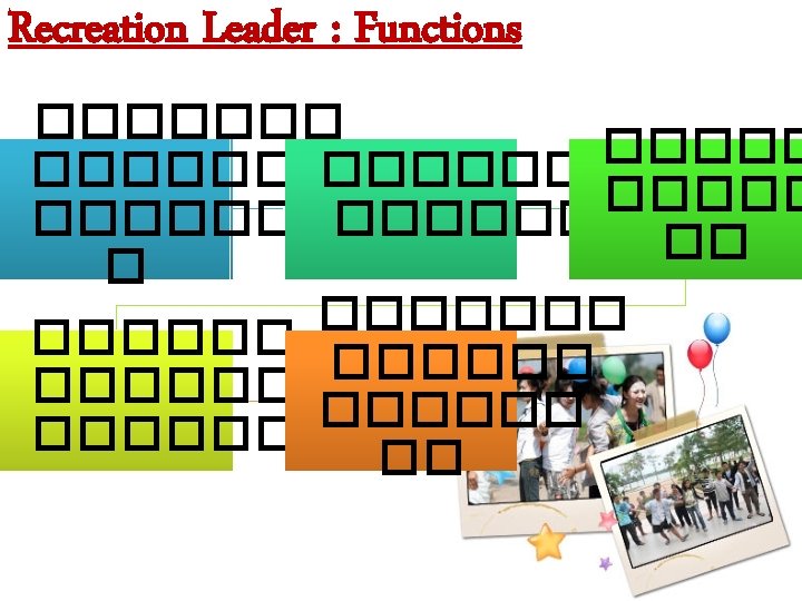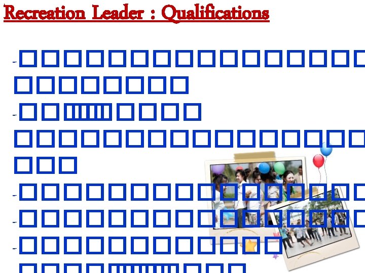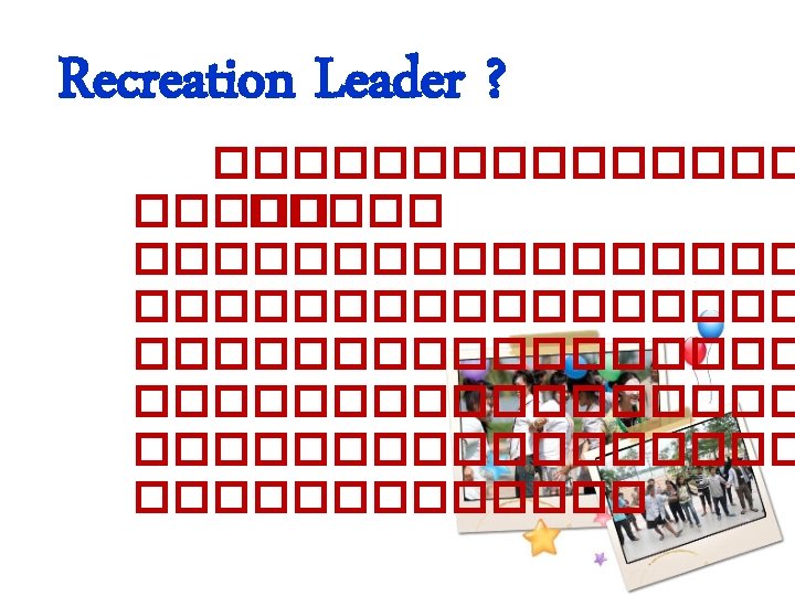 Recreation Leader for Recreation Leader Qualifications of Leader Slides: 14 Download presentation ������� (Recreation Leader) for Recreation Leader Qualifications of Leader knowledge Initiative Human Relations Courage and Firmness Qualifications of Leader Patience Fairness and Honest Alertness Loyalty Modesty Listen Explain Assist Discuss Evaluation Response Salute Health Inspire Patient Roles and functions of Leader Maintenaace of membership Objective attaniment Group interaction facilitation Factors to create Leadership Leader Situation Followers