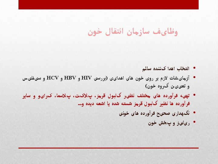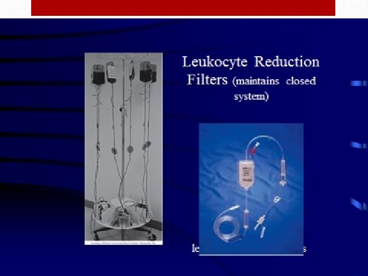 leukocyte-poor (reduced)red cells • Contains : at least 85 %of original red cells • WBC < 5 x 106 • to prevent or avoid nonhemolytic febrile reactions (FNHTR) due to antibodies to white cells and platelets in the recipients exposed to previous transfusions or pregnancies • Reduce rate of HLA alloimmunization among hematology-oncology patients • to minimize transmission of viral disease such as CMV