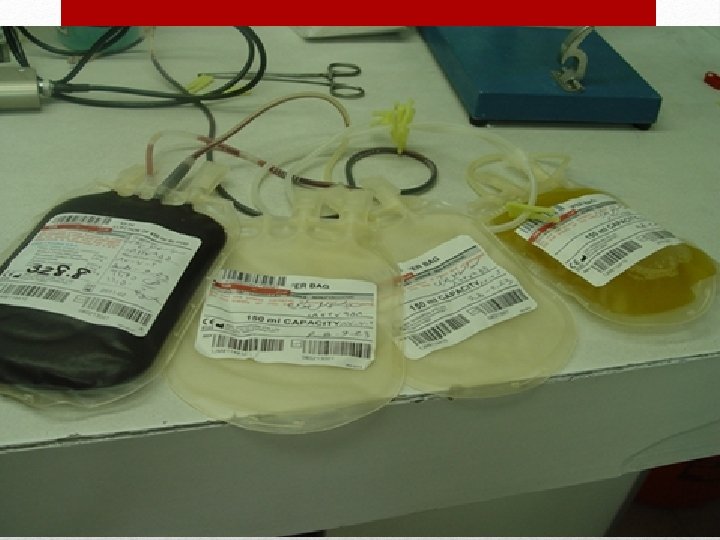 Peadiatric blood bags • Quadruple blood bags • Blood collection in first bag then centrifuged and plasma separated in 2 nd bag • Packed cell divided between 3 bags • Common label for all