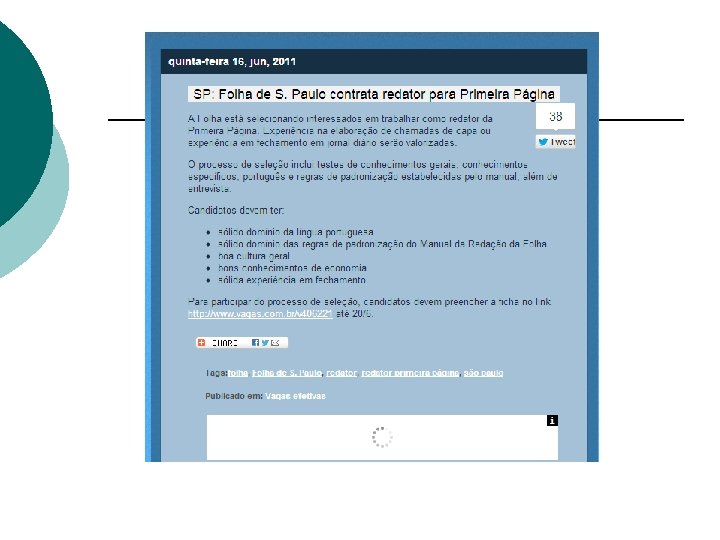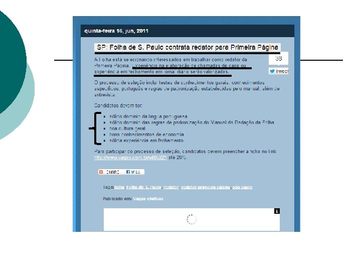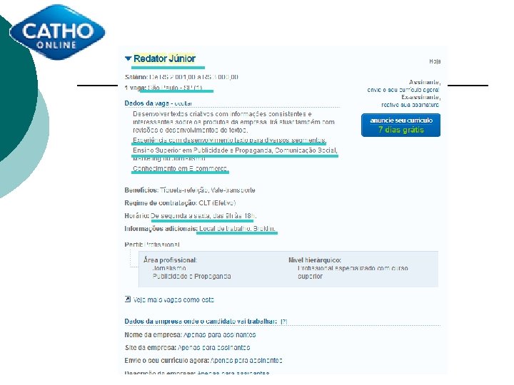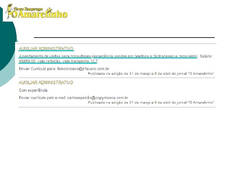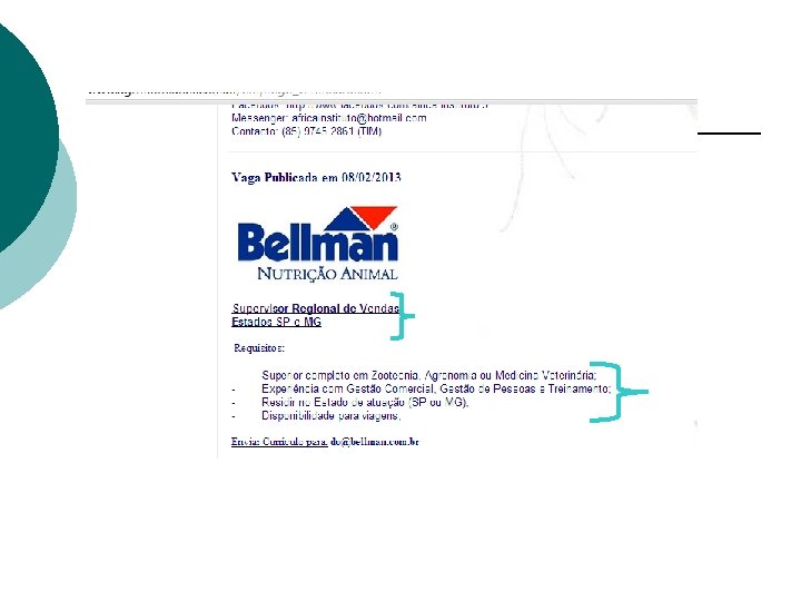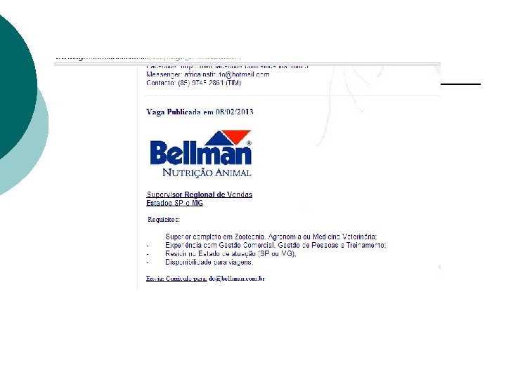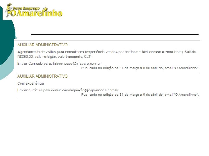 Cuidado!!! • Lacunas ▫ Pessoas instáveis eliminam a cronologia de seus currículos • Dados pessoais ▫ O exagero na colocação de informações pessoais do candidato revela que tem pouco a dizer sobre suas realizações. • Abundância de qualificações ▫ Identificar sempre os verbos de ação: realizei, empreendi, implantei, projetei.