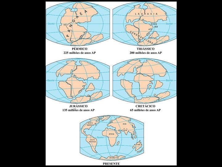 Palavras-chave • Pangea ou Pangeia – continente único. • Permiano – período geológico em que existia ainda o Pangea. • Triássico – período geológico em que teve provavelmente o início da separação do Pangea. • Laurássia – continente formado após a separação do Pangea, que deu origem aos atuais continentes europeu e asiático, por exemplo. • Gondwana – continente formado após a separação do Pangea, dando origem a América do Sul e África, por exemplo