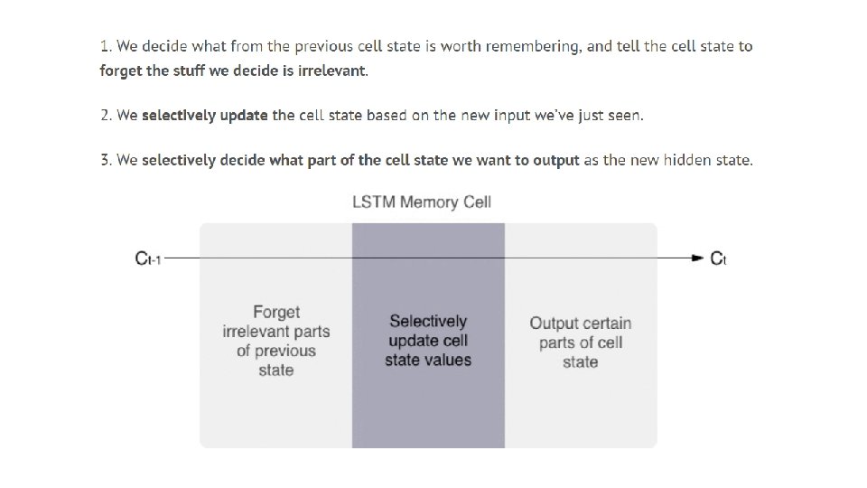 Second step (b): update the old cell state • Ct-1 Ct “We multiply the old state by ft, forgetting the things we decided to forget earlier. Then we add it ∗ ~Ct. This is the new candidate values, scaled by how much we decided to update each state value. ” http: //colah. github. io/posts/2015 -08 -Understanding-LSTMs/ “For the language model example. . this is where we’d actually drop the information about the old subject’s gender and add the new information, as we decided in the previous steps. ” RNN, LSTM v. 7. c 50 Andrew Ng
