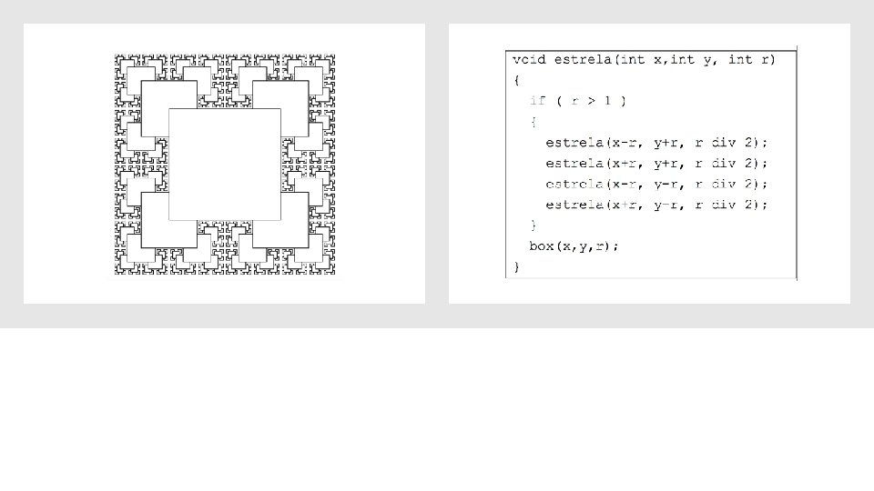 Quando vale a pena usar recursividade • Em Algoritmos complexos, cuja a implementac a o iterativa e complexa e normalmente requer o uso expli cito de uma pilha • Dividir para Conquistar (Ex. Quicksort) • Caminhamento em A rvores (pesquisa, backtracking)