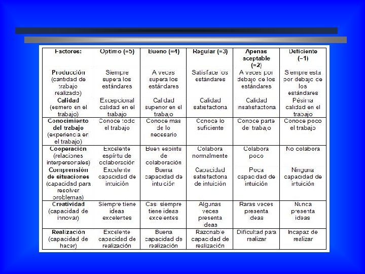 Criterios para Evaluación del Desempeño Habilidades – Capacidades – Necesidades - Rasgos • Conocimiento del Cargo • Conocimiento del Negocio • Puntualidad • Lealtad Metas y Resultados • Cantidad de Trabajo • Reducción de Costos • Reducción de Desperdicios Comportamientos • Desempeño de la tarea • Espíritu de Equipo • Liderazgo • Responsabilidad