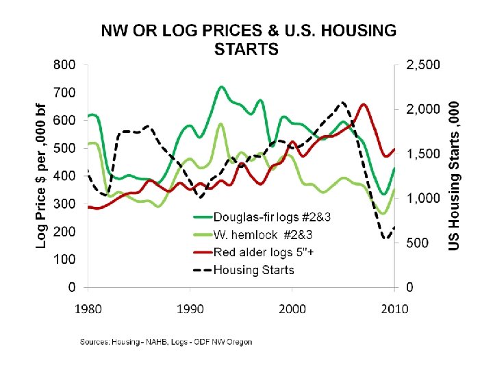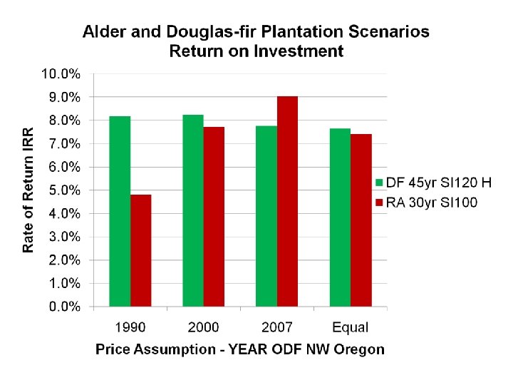 Assumptions for Douglas-fir and Red Alder Plantation Scenarios Regime Species Site Index Yield mbf/ac Age Avg. Log Price logging Cost Net Prep+Plant PCT Stumpage Harvest$ Cost cost PCT year 1990 RA 30 Red Alder 100 30 15 350 200 150 2250 500 100 7 2000 RA 30 Red Alder 100 30 15 525 200 325 4875 500 100 7 2007 RA 30 Red Alder 100 30 15 660 200 460 6900 500 100 7 Equal RA 30 Red Alder 100 30 15 500 200 300 4500 100 7 1990 DF 45 Douglas-fir 120 45 30 580 180 400 12000 500 0 0 2000 DF 45 Douglas-fir 120 45 30 590 180 410 12300 500 0 0 2007 DF 45 Douglas-fir 120 45 30 515 180 335 10050 500 0 0 Equal DF 45 Douglas-fir 120 45 30 500 180 320 9600 500 0 0 1990 DF 45 H Douglas-fir 120 45 40 580 180 400 16000 500 0 0 2000 DF 45 H Douglas-fir 120 45 40 590 180 410 16400 500 0 0 2007 DF 45 H Douglas-fir 120 45 40 515 180 335 13400 500 0 0 Equal DF 45 H Douglas-fir 120 45 40 500 180 320 12800 500 0 0