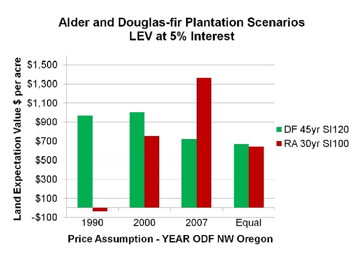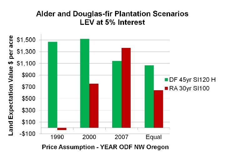 Assumptions for Douglas-fir and Red Alder Plantation Scenarios Regime Species Site Index Yield mbf/ac Age Avg. Log Price logging Cost Net Prep+Plant PCT Stumpage Harvest$ Cost cost PCT year 1990 RA 30 Red Alder 100 30 15 350 200 150 2250 500 100 7 2000 RA 30 Red Alder 100 30 15 525 200 325 4875 500 100 7 2007 RA 30 Red Alder 100 30 15 660 200 460 6900 500 100 7 Equal RA 30 Red Alder 100 30 15 500 200 300 4500 100 7 1990 DF 45 Douglas-fir 120 45 30 580 180 400 12000 500 0 0 2000 DF 45 Douglas-fir 120 45 30 590 180 410 12300 500 0 0 2007 DF 45 Douglas-fir 120 45 30 515 180 335 10050 500 0 0 Equal DF 45 Douglas-fir 120 45 30 500 180 320 9600 500 0 0 1990 DF 45 H Douglas-fir 120 45 40 580 180 400 16000 500 0 0 2000 DF 45 H Douglas-fir 120 45 40 590 180 410 16400 500 0 0 2007 DF 45 H Douglas-fir 120 45 40 515 180 335 13400 500 0 0 Equal DF 45 H Douglas-fir 120 45 40 500 180 320 12800 500 0 0