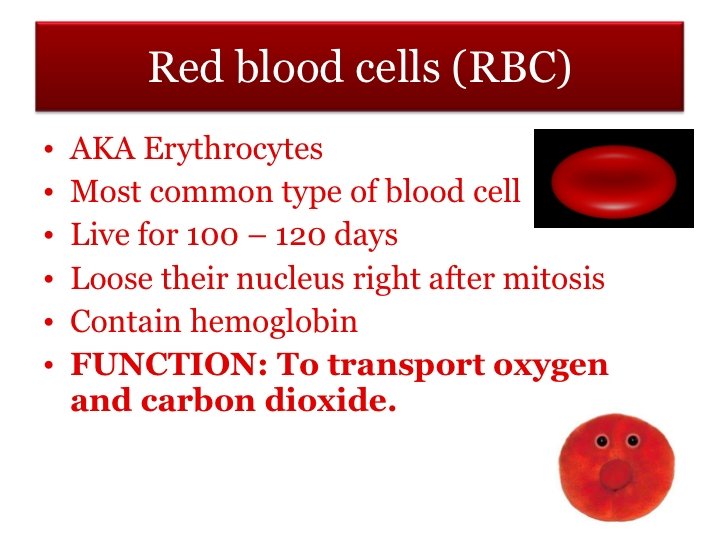 Red Blood Cells (RBC) • Description: – 4 -6 billion in 1 m. L of blood – Red-coloured cell – biconcave disks – have no nucleus and few organelles – Erythrocytes • Functions: – Transports Oxygen with the help of a protein called Hemoglobin (found in RBC)