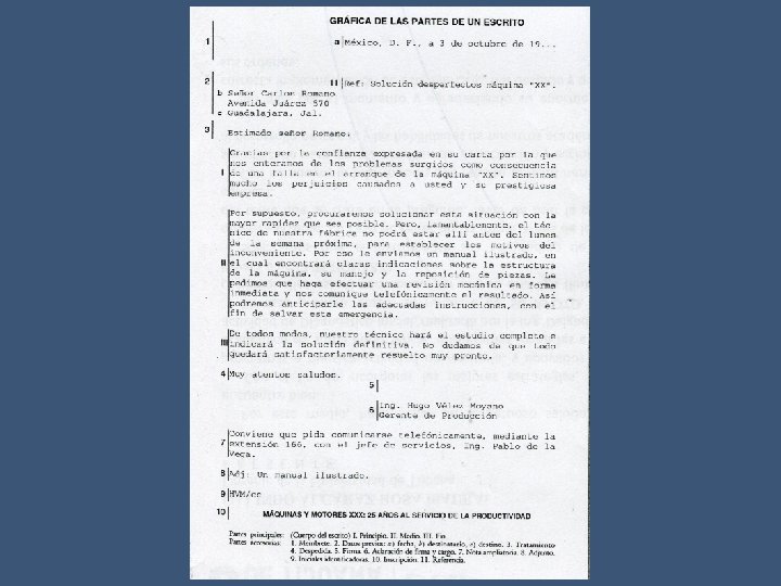 Partes accesorias: -Datos previos 1. -Nombre del lugar desde donde se escribe. Ejemplo: Tijuana, si va a cualquier lugar del estado de Baja California. Tijuana, BC. , si va a cualquier parte de la República y se agrega el país, cuando va fuera. 2. -Fecha: día, mes y año (15 de enero de 2015). 3. -Nombre y referencias del destinatario: Nombre completo de la persona o personas, incluido título (colocar cargo antes de que nombre). Ejemplo: Señor Jefe de…, o Ing. N. N. ”. Cuando es para una entidad corporativa, se pone en nombre de la entidad en forma impersonal (sin el “señores”). 4. -Destino de escrito: Datos completos del domicilio (calle, número, localidad) En caso de ser entregado directamente, basta con indicar el nombre de donde se encuentra el receptor (institución, dependencia, hotel, negocio, etc. ) 5. -Forma de entrega: En algunos casos se debe indicar la manera como se hace llegar el escrito al destinatario, en forma directa colocando “Presente” o a través de intermediarios (Atención del Sr…”).