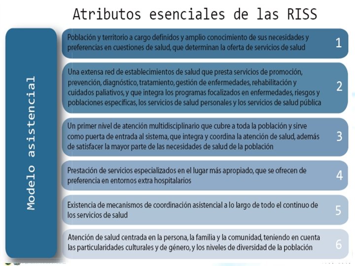 Los beneficios de las RISS • • Mejoran la accesibilidad al sistema Reducen el cuidado inapropiado Reducen la fragmentación del cuidado asistencial Mejoran la efectividad clínica de los servicios Evitan la duplicación de infraestructura y servicios Reducen los costos de producción y de transacción Responden mejor a las necesidades y expectativas de salud de las personas/comunidad