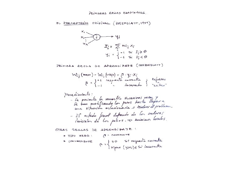 Historia de las Redes Neuronales Artificiales (Primera Epoca) AÑO AUTORES CONTRIBUCIÓN 1943 W. Mc. Culloch, W. Pitts Neurona formal 1949 Donald Hebb Aprendizaje hebbiano 1950 N. Wiener Cybernetics 1951 y 56 J. von Neuman Automata y computacion neuronal. Redundancia 1951 M. Minsky Neurocomputer 1957 y 62 F. Rosenblatt Regla delta y Perceptron 1962 B. Widraw ADALINE 1963 Winograd y Cowan Proceso distribuido 1969 M. Minsky y S. Papert Critica al perceptron