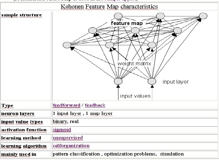 Types of Neural Nets Kohonen Feature Map • The Kohonen Feature Map was first introduced by finnish professor Teuvo Kohonen (University of Helsinki) in 1982. It is probably the most useful neural net type, if the learning process of the human brain shall be simulated. The "heart" of this type is the feature map, a neuron layer where neurons are organizing themselves according to certain input values. The type of this neural net is both feedforward (input layer to feature map) and feedback (feature map). (A Kohonen Feature Map is used in the sample applet)