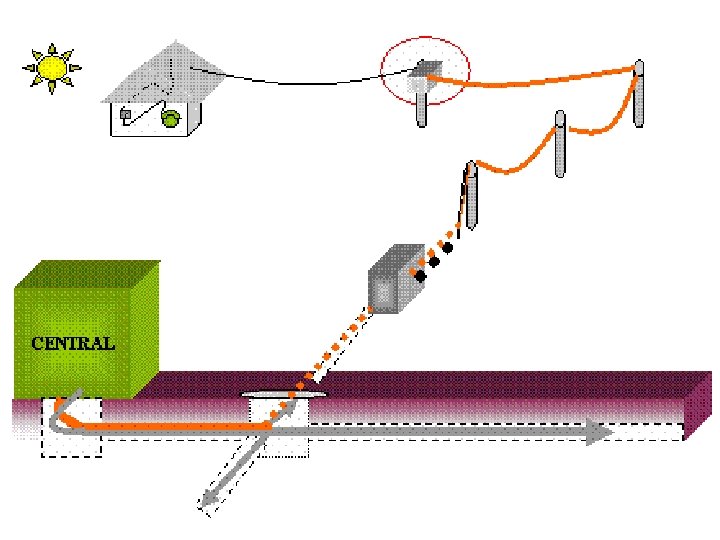 Elementos de la red local Línea de acometida: parte de la línea de abonado que va del punto de dispersión al inmueble del abonado. Zona de dispersión : Zona servida por un punto de distribución. Central Satélite : Es una variante de la central no atendida. Cuando se emplea una central satélite, un elemento de conmutación parcial y alejado, de servicio a una serie de números tomados entre los asignados a la central principal.