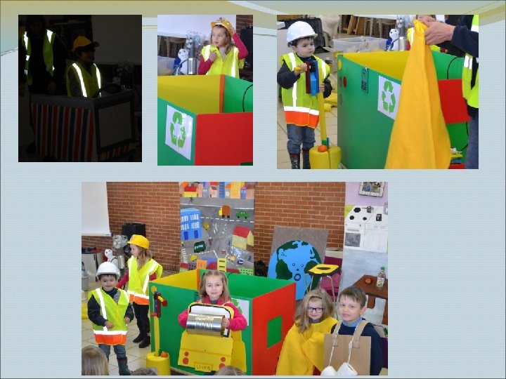 Des enfants ont trié des déchets, Ilyés a conduit le camion pour les emporter à l’usine de recyclage. Lola a mis les déchets dans la machine de l’usine. Noa a mis la machine en route. Ca faisait des couleurs.