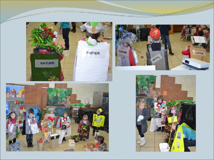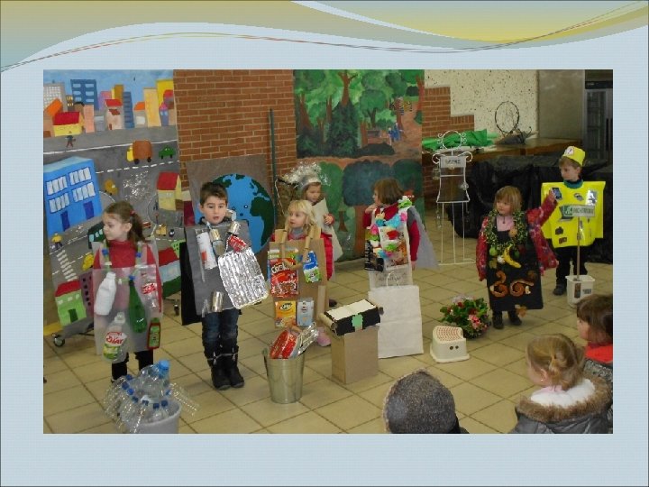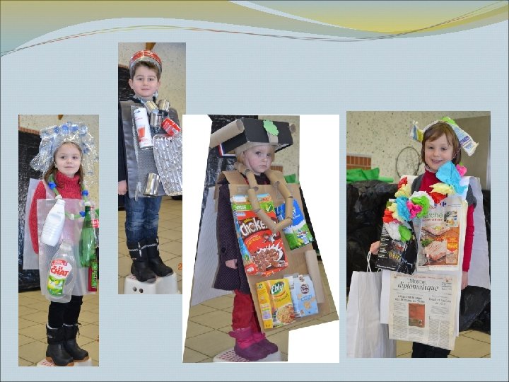 Mr Métal (Floran) Boîte de conserve, boîte de coca… Mme plastique (Victoire) Bouteille d’eau, de lait… Mr Verre Bouteille en verre Mme Papier (Chloé) Journal, pub… Mme Carton (Louane et Coline) Carton Mme Nature (Emmy Teneur) Epluchure, feuilles. . Mr Danger (Louis) Déchets électroniques, piles, …