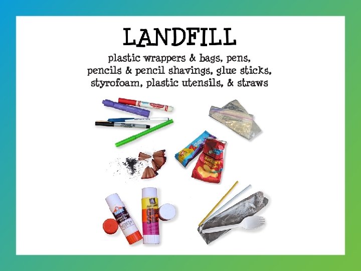 Garbage Plastic Bags Black Plastic Gloves Styrofoam Toys Hangers Plastic Utensils Snack Wrappers Broken Glasses/Cups