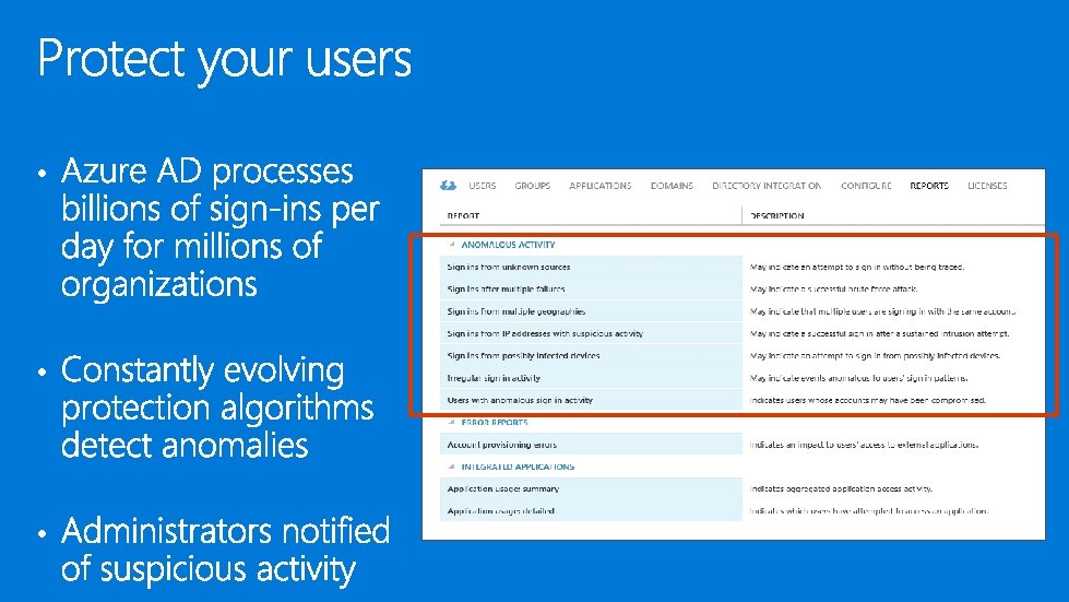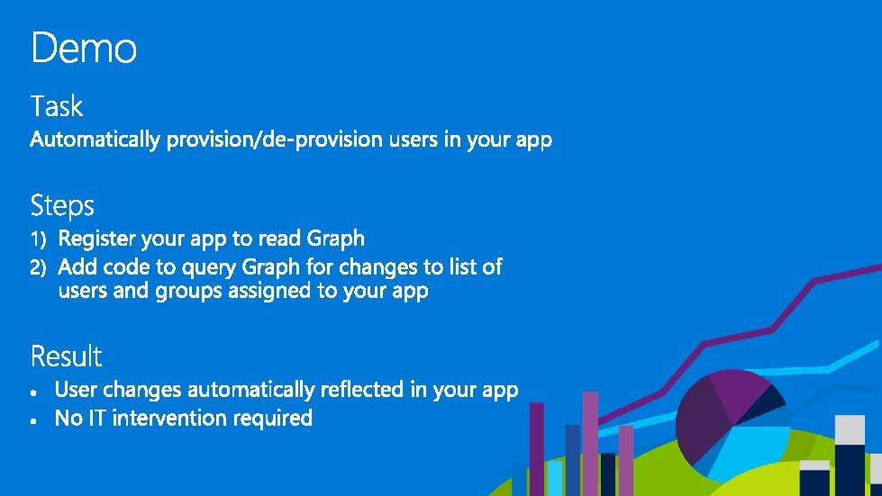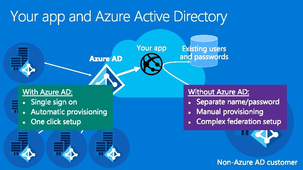 Reduce sign up and sign in friction Accelerate user adoption and engagement Automate user provisioning by supporting Azure AD for sign in by using Azure AD Graph to find users by using Graph to track user assignment