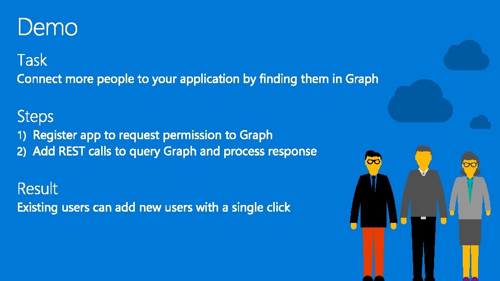 Tip #1 Tip #2 Tip #3 Users can query basic details of other users but can’t query groups (yet) or org hierarchy – for that, admin must consent first You don’t get user’s email name in sign in token today, just sign in name (which looks like email name) – query graph to get email name Get user’s profile photo from graph to provide more personalized experience http: //aka. ms/aaddev