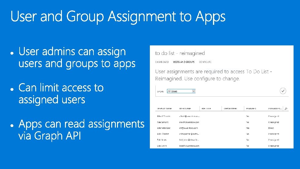 Tip #1 Tip #2 Tip #3 Use app permissions, not delegated user permissions, to read assignments from graph Use directory schema extensions to store your app’s user profile data in the directory << Baz >> http: //aka. ms/aaddev