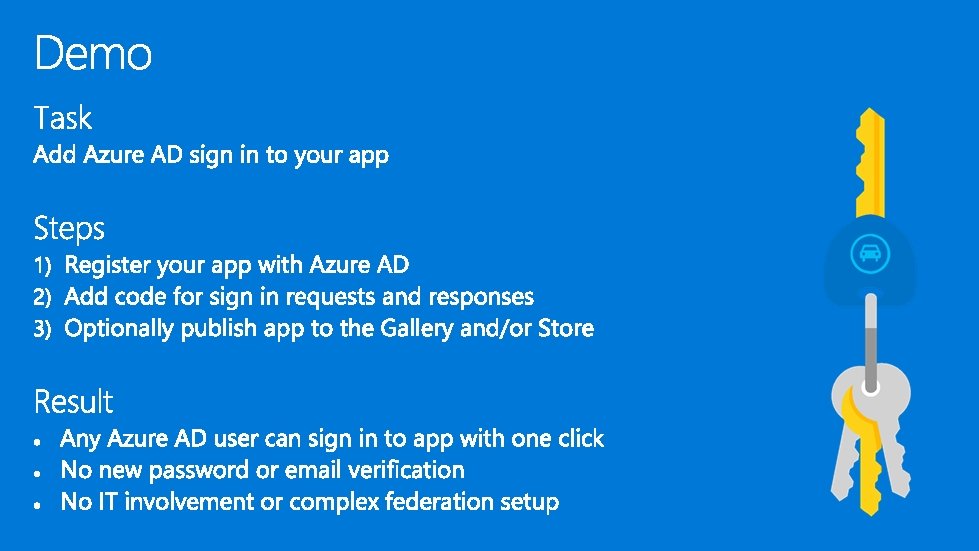Tip #1 Tip #2 Tip #3 Use quick starts in Azure AD developer guide to learn how to add sign in to your app Use available open source libraries to simplify development Use recommended branding to drive familiarity of work account sign in http: //aka. ms/aaddev