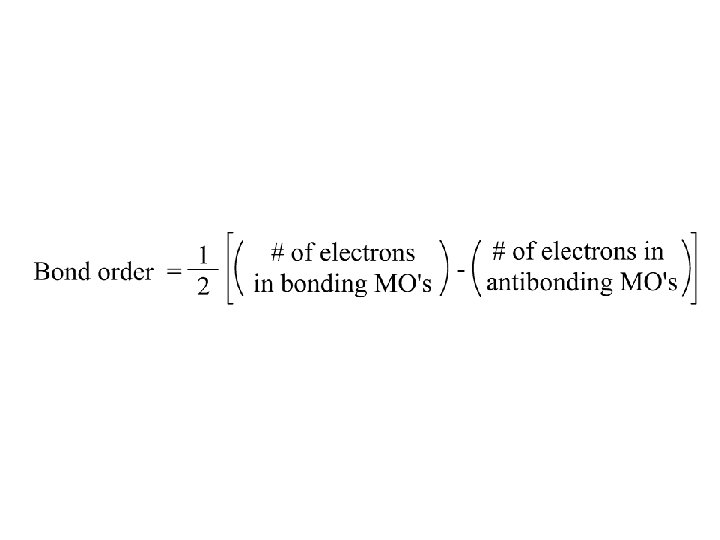 O 2 (2 x 8 e) 1/2 (10 - 6) = 2 A double bond Or counting only valence electrons: 1/2 (8 - 4) = 2 Note subscripts g and u symmetric/antisymmetric upon i