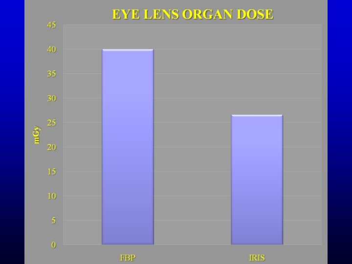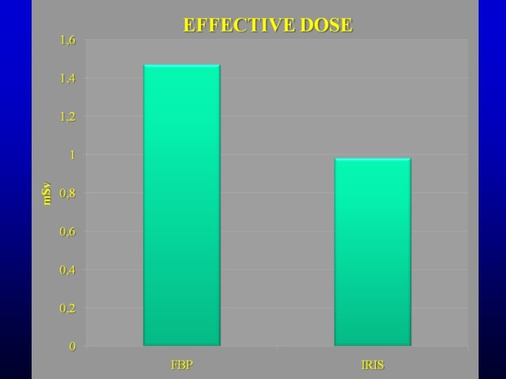 Results: radiation dose FBP (n = 200) IRIS (n = 200) Reduced against FBR by CTDIvol [m. Gy] 33. 29 22. 41 - 32. 7 % DLP [m. Gy. cm] 589. 7 396. 2 -32. 8 % Effective dose [m. Sv] 1. 47 ± 0. 26 0. 98 ± 0. 15 - 33. 3 % Organ dose to the eye lens [m. Gy] 40. 0 ± 3. 3 26. 6 ± 2. 0 - 33. 5 %