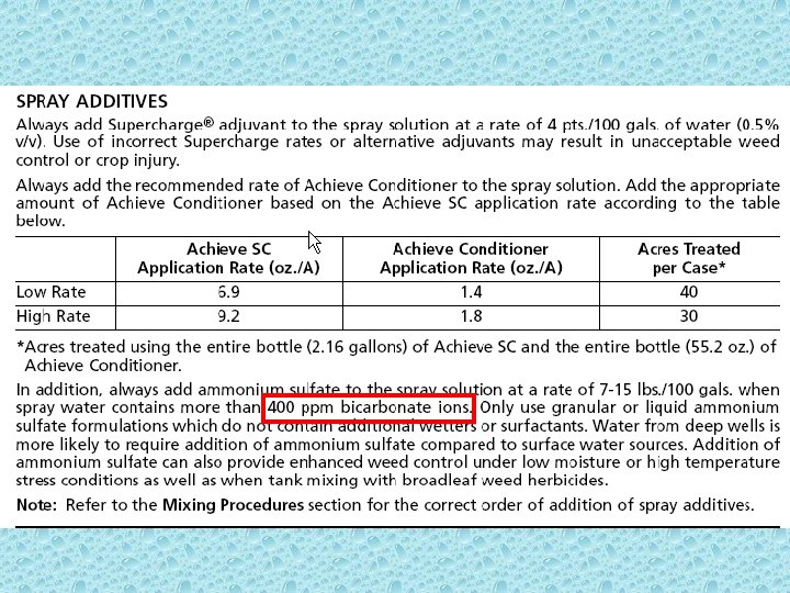 Bicarbonate Waters • Associated with sodium • > 500 ppm & high p. H • Affects 2, 4 -D • Affects “dim” herbicides • Poast - sethoxydim • Select – clethodim • Achieve -tralkoxydim