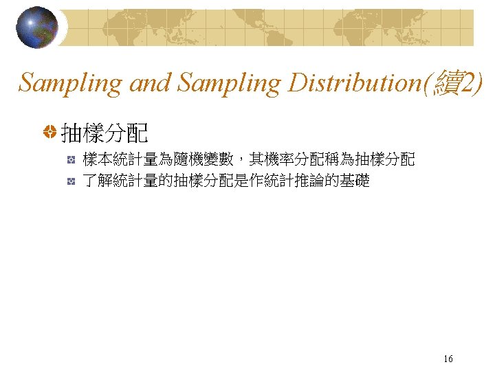 Sampling and Sampling Distribution(續1) 母體參數與樣本統計量 15