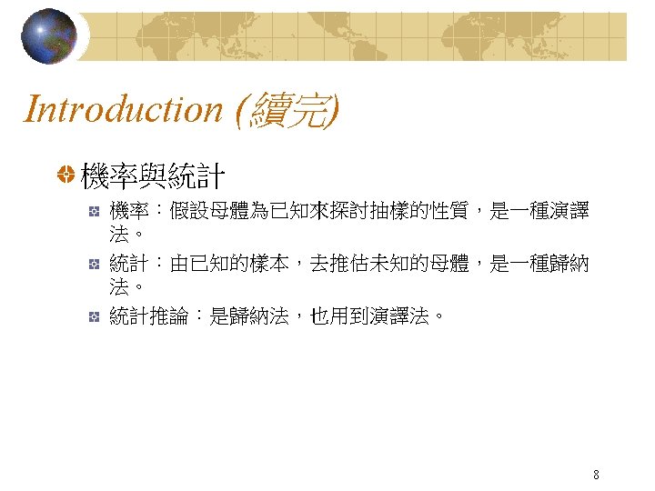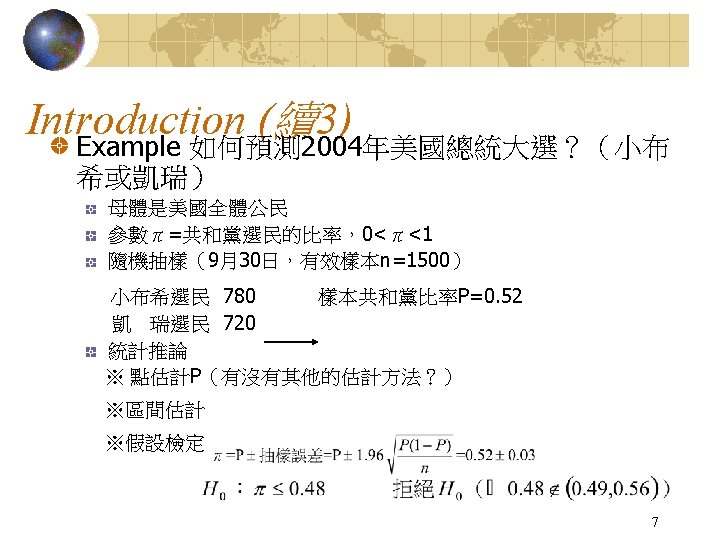 Introduction (續2) The procedures of statistical inference Population Statistical Model and Parameters Sample Statistical Inference 6