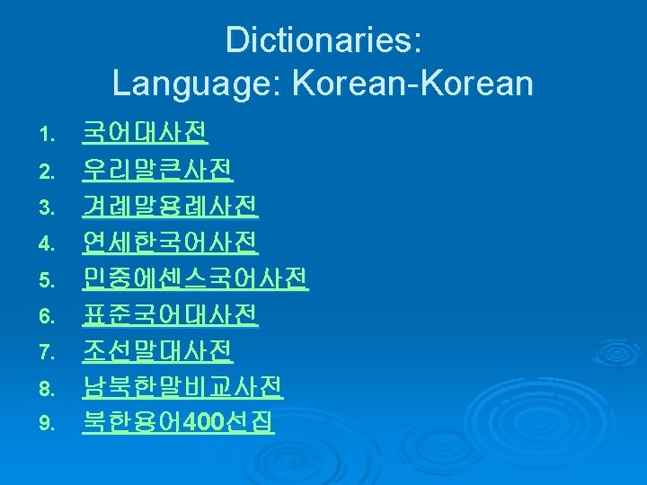 Dictionaries: Language: English-Korean 1. 2. 3. 4. 5. 6. The New world comprehensive Korean. English dictionary Handbook of Korean vocabulary : a resource for word recognition and comprehension A Korean-English dictionary NTC's compact Korean and English dictionary 엣센스한영사전 = Minjung's essence Korean. English dictionary 조영대사전 = New Korean-English dictionary