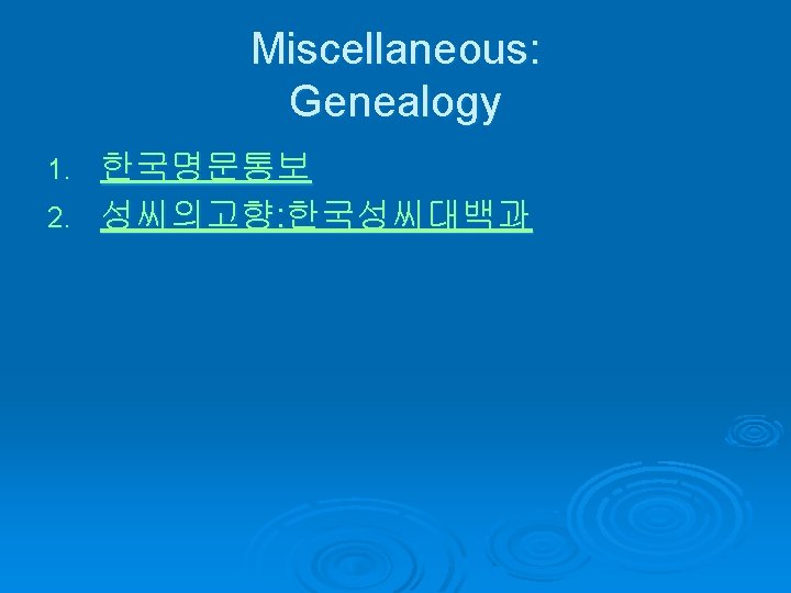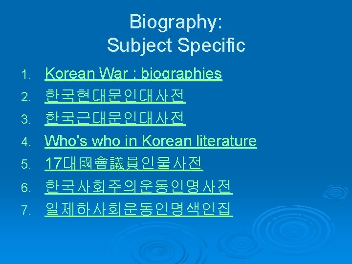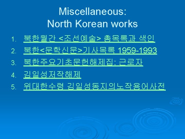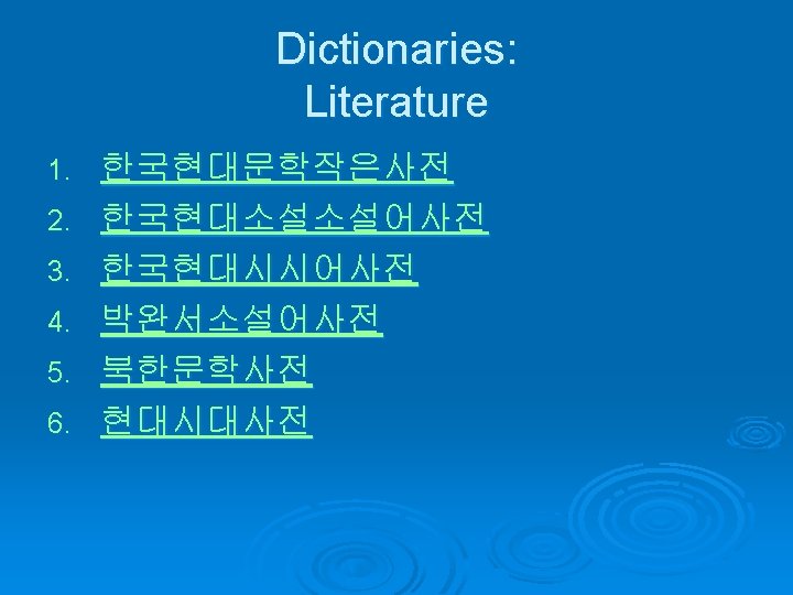 Miscellaneous: Literature bibliography 1. 2. 3. 4. 5. 한국문학논저유형별총목록 (18951999) 한국현대문학작품년표 한국문집총색인 한국문학번역서지목록 An annotated bibliography of Korean literature in translation 1980 -2002