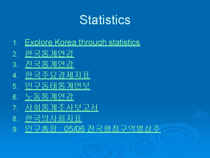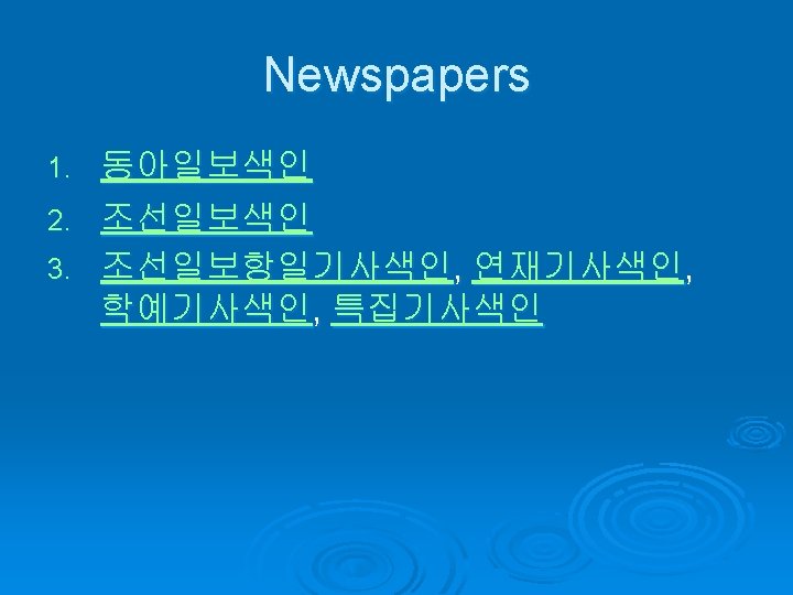 Annuals, Yearbooks 1. 2. 3. 4. 5. 6. 7. 8. 9. 10. Korea annual 회사연감 Korea Company yearbook 산업생산연보 = annual repot on current industrial production survey 주요무역동향지표 한국경제연감 한국교육연감 (한국교육명부) 조선중앙연감 북한연감 한국출판연감