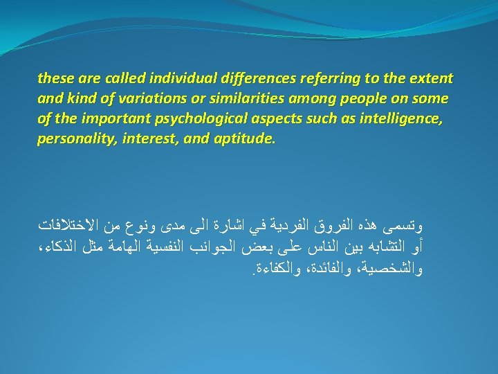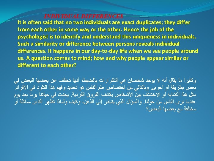 References: 1 - Chamorro-Premuzic, Tomas, Sophie von Stumm and Adrian Furnham (eds)(2011). The Wiley-Blackwell Handbook of Individual Differences. 2 - Kanai, R. , & Rees, G. (2011). The structural basis of inter-individual differences in human behaviour and cognition. Nature Reviews Neuroscience, 12, 231 -241. 3 - Maltby, J. Day, L. & Macaskill, A. (2007). Personality, Individual Differences and Intelligence. London: Pearson Education. http: //www. pearsoned. co. uk/Bookshop/detail. asp? item=10000090816 : ﺍﻟﻤﺮﺍﺟﻊ 1 - Chamorro-Premuzic, Tomas, Sophie von Stumm and Adrian Furnham (eds)(2011). The Wiley-Blackwell Handbook of Individual Differences. 2 - Kanai, R. , & Rees, G. (2011). The structural basis of inter-individual differences in human behaviour and cognition. Nature Reviews Neuroscience, 12, 231 -241. 3 - Maltby, J. Day, L. & Macaskill, A. (2007). Personality, Individual Differences and Intelligence. London: Pearson Education. http: //www. pearsoned. co. uk/Bookshop/detail. asp? item=10000090816