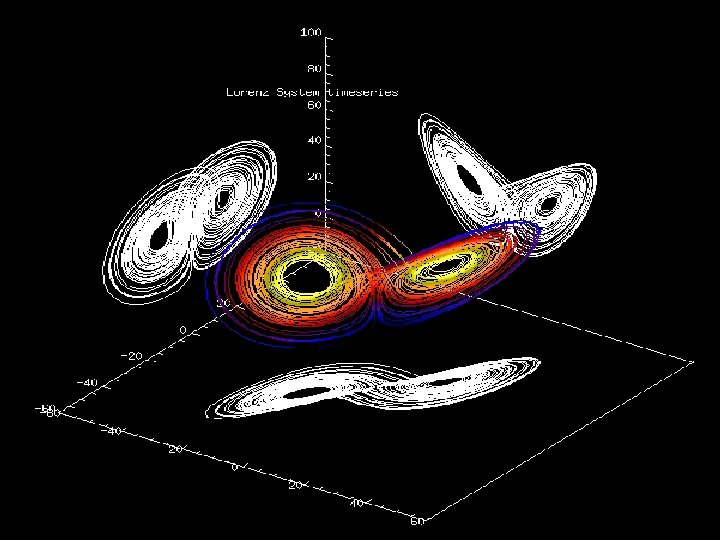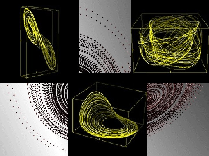 Primer ejemplo. El Atractor de Lorenz Condición Inicial (x 0, y 0, z 0) Regla (x 1, y 1, z 1) Regla (x 2, y 2, z 2). . . ITERACION segundo temperatura 1 -14. 052872 1 - 2 2. 757209 2 - 3 -7. 552990 3 - 4 6. 621076 4 - 5 -8. 084304 5 - 6 -9. 952578 6 -9. 952000 7 -5. 981163 7 -6. 120309 8 -13. 023813 8 -12. 646284 9 0. 041168 9 -0. 724073 10 9. 314363 10 11. 848833 11 4. 558919 11 -1. 204758 12 7. 375924 12 6. 826824 13 -14. 856846 13 13. 773982 14 -0. 246566 14 1. 474239