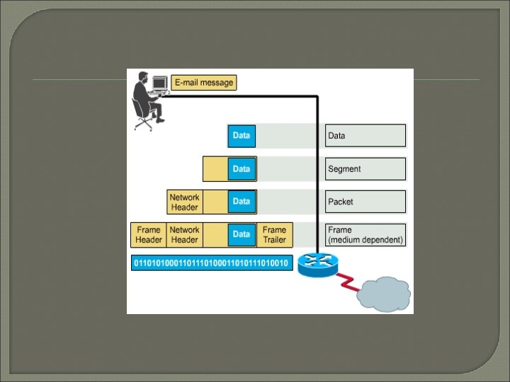 Enkapsulasi Data Enkapsulasi membungkus data dengan informasi protokol yang diperlukan sebelum dikirim. Sehingga, ketika bergerak turun melewati layer-layer OSI, paket data menerima header, trailer, dan informasi lain. Lima langkah konversi untuk enkapsulasi data: 1. Membuat data 2. Masukkan data dalam segment 3. Masukkan segment dalam paket atau datagram 4. Masukkan paket dalam frame 5. Konversi frame ke pola 1 dan 0 (bit)