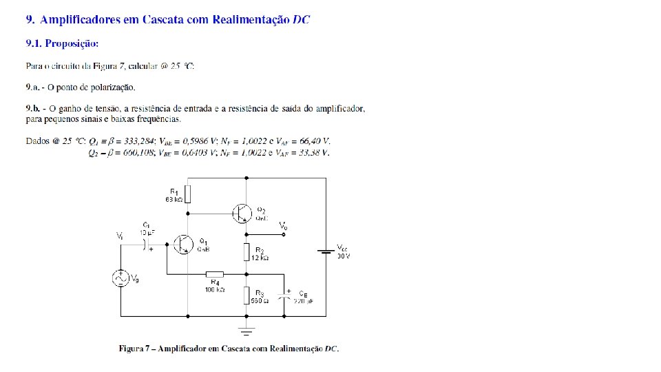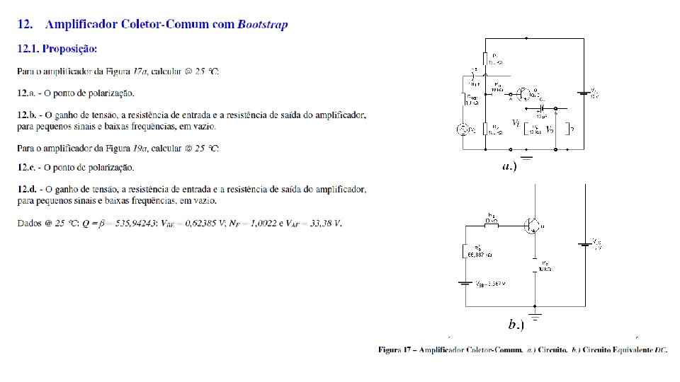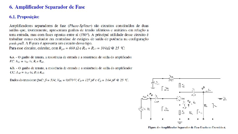 Exercício Assunto Pg. Análise DC Pg. Análise AC Pg. 1 Parâmetros de Modelagem 1 -3 não 2 Polarização por Divisor de Tensão 3 -6 sim 3 -6 não 3 Amplificador Emissão Comum 6 -9 sim 3 -6 sim 7 -9 4 Amplificador Base Comum 9 -14 sim 9 -12 sim 12 -14 5 Amplificador Coletor Comum 14 -18 sim 14 -16 sim 16 -18 6 Amplificador Separador de Fase 18 -22 sim 19 -20 sim 20 -22 7 Amplificadores em Cascata com Acoplamento DC 22 -28 sim 23 -26 sim 26 -28 8 Amplificadores em Cascata com Acoplamento DC 28 -35 sim 29 -32 sim 32 -35 9 Amplificadores em Cascata com Realimentação DC 35 -41 sim 35 -38 sim 38 -41 10 Amplificadores em Cascata com Bootstrap 41 -48 sim 41 -42 sim 42 -48 11 Amplificadores em Cascata com Realimentação Negativa 48 -56 sim 41 -42 sim 48 -56 12 Amplificador Coletor-Comum com Bootstrap 55 -62 sim 56 -57 sim 57 -62 13 Amplificador Cascode 62 -69 sim 62 -66 sim 66 -69 14 Amplificador Emissor-Comum com Alimentação Flutuante 69 -73 sim 69 -70 sim 70 -73