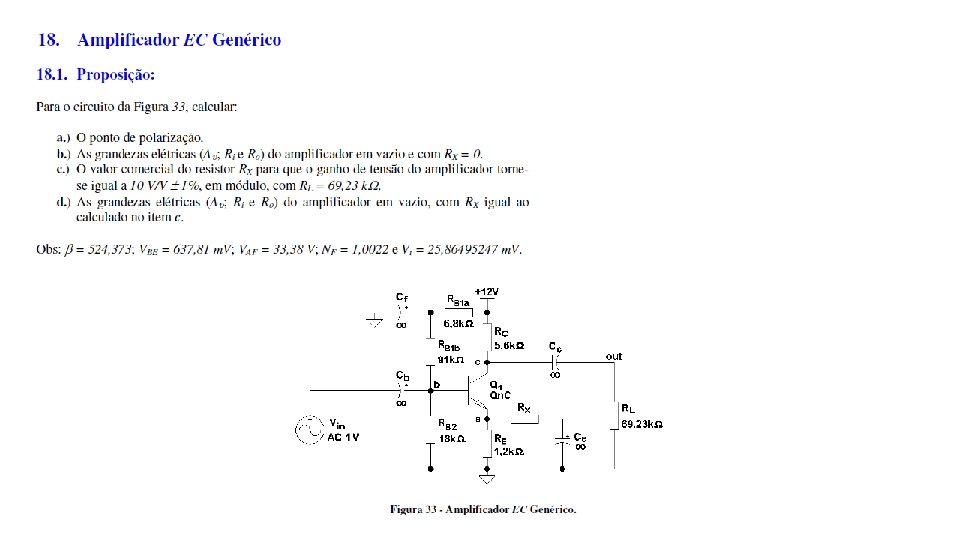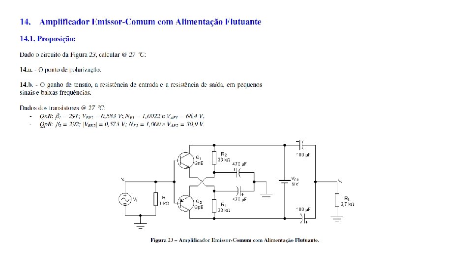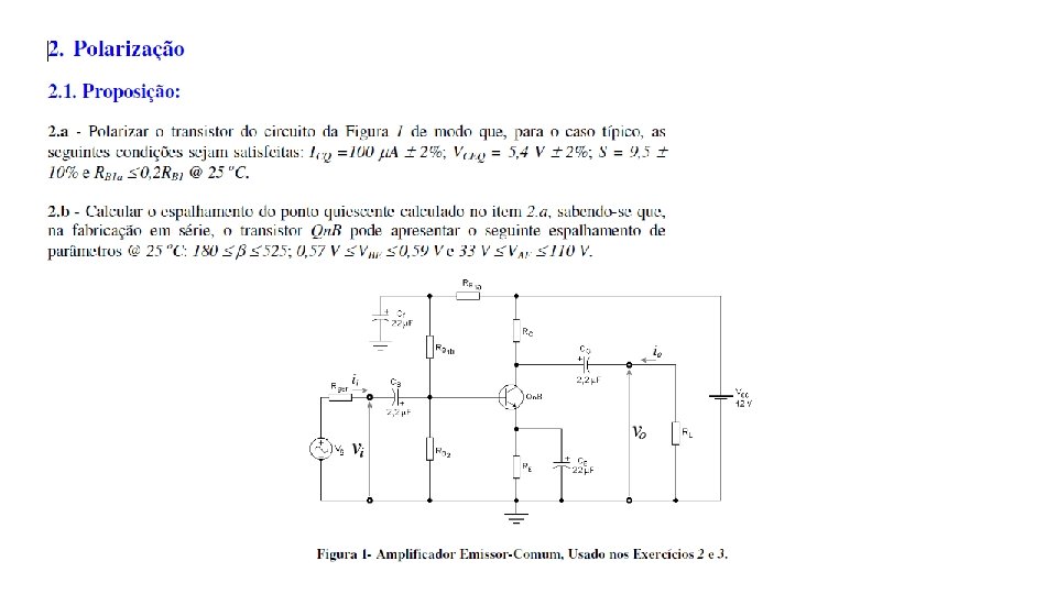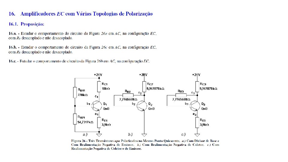 Exercício Assunto Pg. Análise DC Pg. Análise AC Pg. 15 Estabilidade de Pontos Quiescentes (comparação) 75 -81 sim 74 -75 não Topologia 1 75 -76 77 79 15 Estabilidade de Pontos Quiescentes (comparação) 75 -81 sim 75 não Topologia 2 76 77 -78 79 -80 15 Estabilidade de Pontos Quiescentes (comparação) 75 -81 sim 75 não Topologia 3 76 -77 78 -79 80 16 Amplificadores EC com Várias Topologias de Polarização 81 -89 não sim 82 -85 Topologia 1 16 Amplificadores EC com Várias Topologias de Polarização 81 -89 não sim 82 -85 Topologia 3 16 Amplificadores EC com Várias Topologias de Polarização 85 -88 não sim 88 -89 Topologia 1