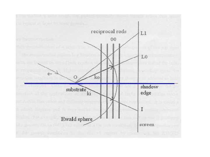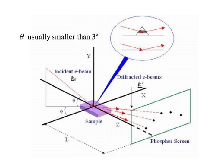 The Geometry of RHEED • The geometry of RHEED is quite simple, Fig. 1. An accelerated electron beam (5 – 100 ke. V) is incident on the surface with a glancing angle (< 3 deg) and is reflected. The high energy of the electrons would result in high penetration depth. However, because of the glancing angle of incidence, a few atomic layers are only probed. This is the reason of the high surface sensitivity of RHEED. Upon reflection, electrons diffract, forming a diffraction pattern that depends on the structure and the morphology of the probed surface.
