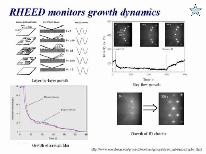 RHEED • Reflection High Energy Electron Diffraction, RHEED, is an important real time analytical tool to monitor growth front condition. Substrate thermal cleaning monitoring ØControlling initial growth stage ØMonitoring surface structure and growth dynamics ØGrowth rate measurement Ø • The small incident angle makes it sensitive to the structure of top monolayers.