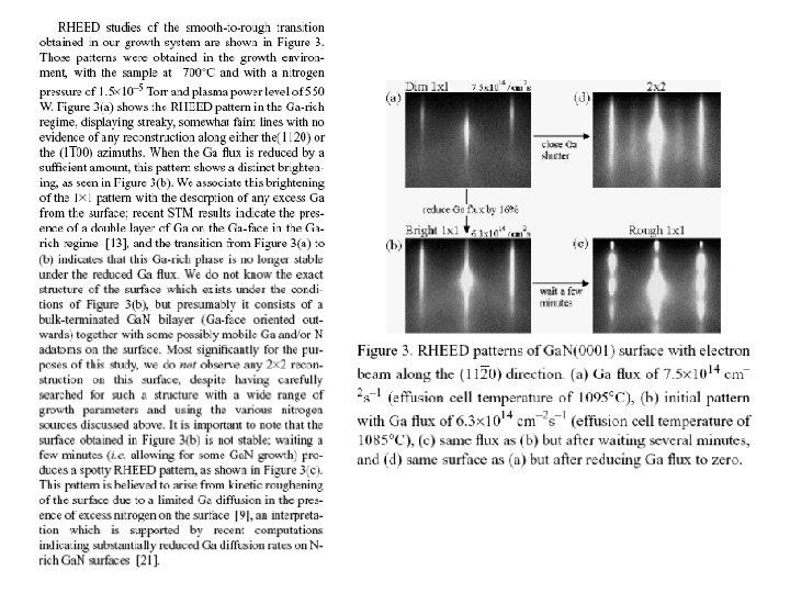 Surface Reconstruction • In order to minimize the energy of the near-surface region of the crystal, the atoms rearrange themselves in a regular fashion which exhibits long range order. Each ordered arrangement of the near surface region is known as a surface reconstruction. • Surface reconstruction reflects the stoichiometry of the growth process and influences the growth mechanism. • RHEED is used to monitor the surface reconstruction of the growth front since it is sensitive to atomic layers near the surface. • Usually surface reconstruction is affected by substrate temperature, impinging fluxes, III/V flux ratio, and the existence of surfacants.
